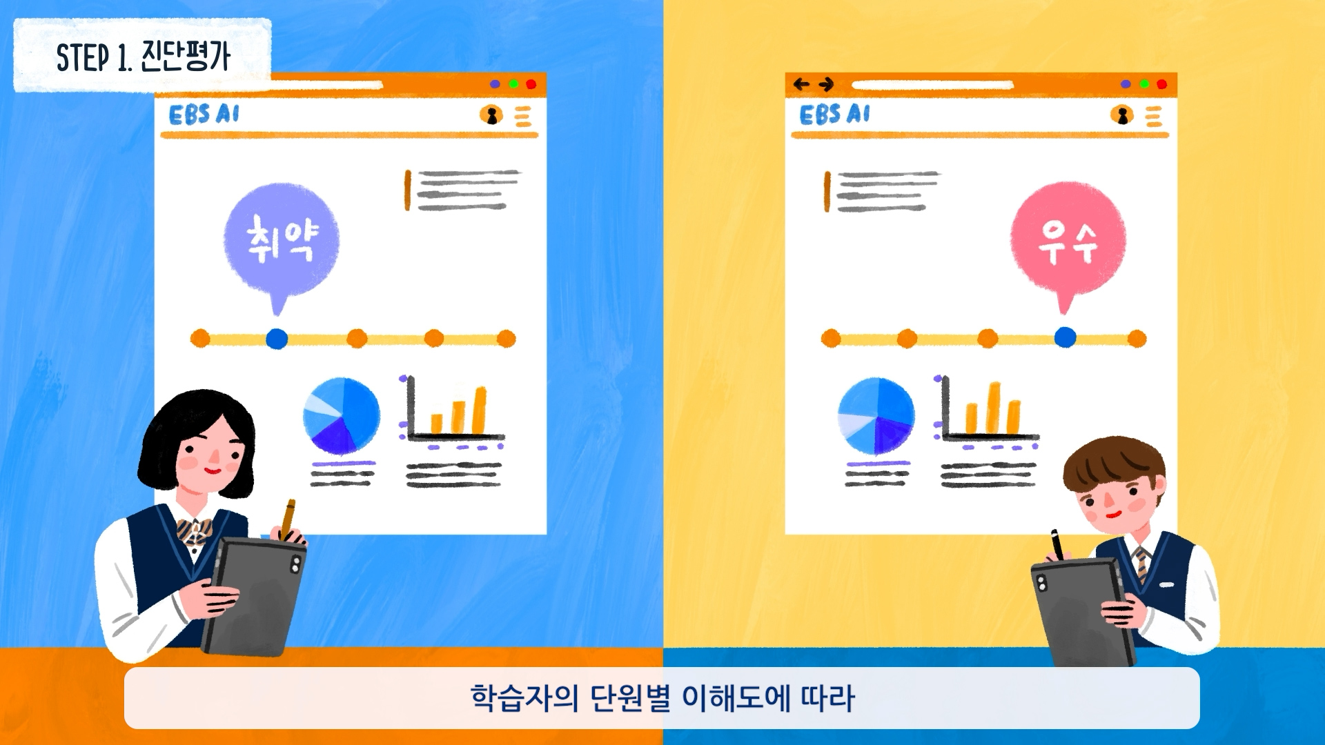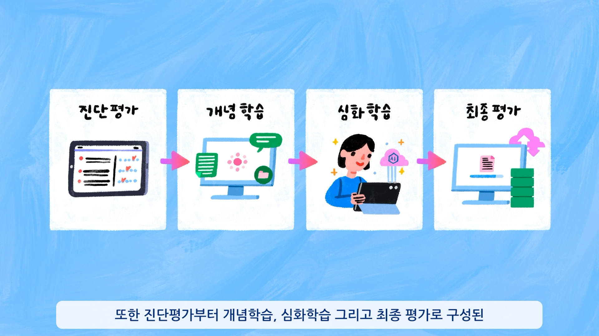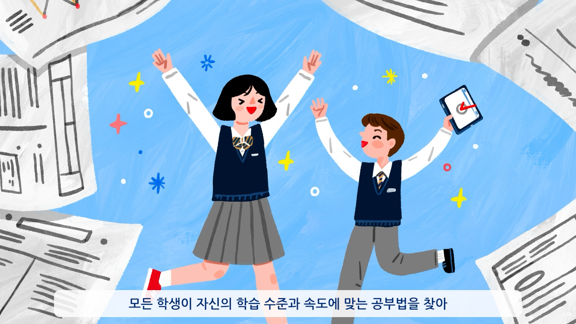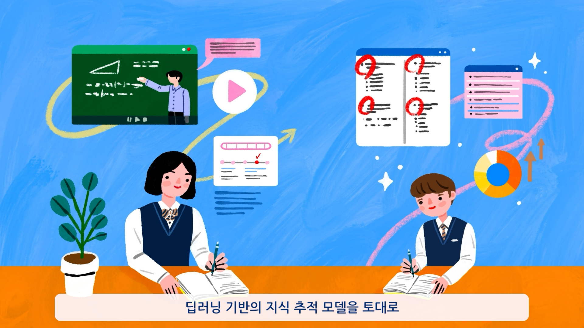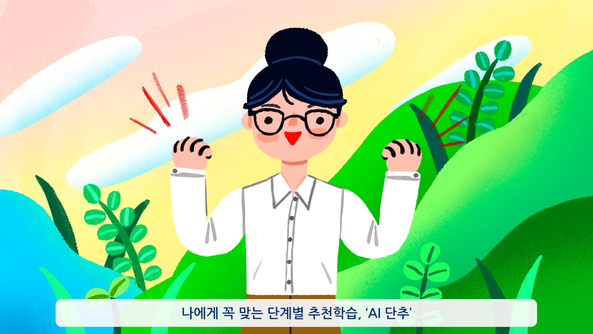 학습자의 이해도에 맞춘 문제 제안, 개인별 학습 경로 설계, 자동화된 학습 지원 시스템이라는 서비스의 강점을 리듬감 있는 그래픽 흐름과 명확한 시각 언어로 풀어내며, 버튼플러스가 지향하는 스마트한 자기주도 학습 환경을 쉽고 생동감 있게 전달했다.